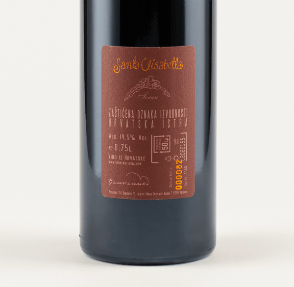 Der Name dieses großen Teran stammt von dem gleichnamigen Weinberg, den die Familie Benvenuti vor 16 Jahren anlegte. Es ist eine fantastische Lage auf 330 Metern über dem Meeresspiegel mit einem hohen Anteil an Mergel und Kalkstein im Boden. Es gibt nie Nebel und es ist den ganzen Tag sonnig. Schonungslos ist die Auswahl der Trauben für diesen nach ihm benannten Wein. Sie eliminierten mehr als die Hälfte der Ernte durch Kurzschnitt und grüne Lese, damit die verbleibenden Trauben alle Nährstoffe aufnehmen und die höchstmögliche Qualität liefern. Eine zusätzliche Auswahl an Trauben wurde bei der Ernte der dritten Auswahl in den Keller gebracht, nachdem der Wein 2,5 Jahre in slawonischen und französischen Holzfässern mit unterschiedlichen Volumina von 225, 500 und 2500 Litern gelagert wurde. Santa Elisabeth, 2016 ist mit nur 2700 Flaschen auf dem Markt.