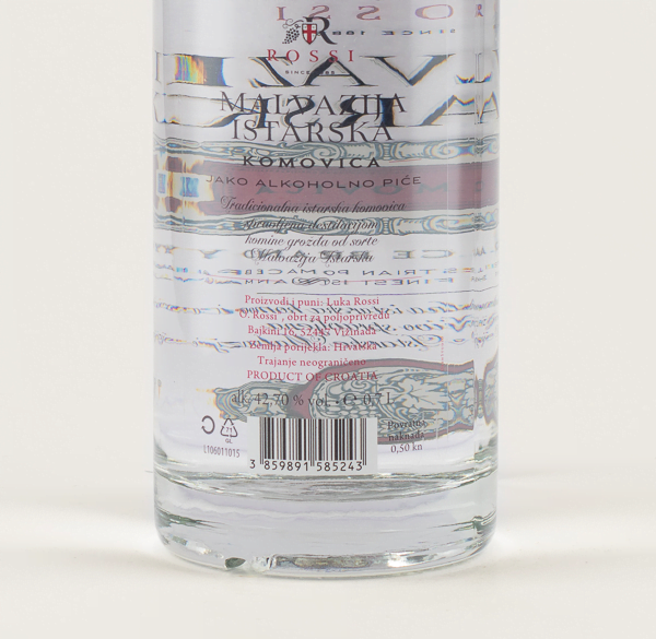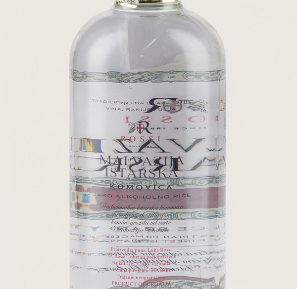 Malvazija istarska obitelji Rossi je tradicionalno rađena istarska Komovica napravljena destilacijom probrane komine grožđa od autohtone domaće malvazije. Redistilirana je četiri puta kako bi, uz kristalnu bistrinu i prozirnost, dobila svoju intenzivnu punoću i eleganciju okusa. Decentan miris sorte prati miris cvijeća, kore agruma i začinskog bilja. Na okusu je suha i ugodno topla, s dugotrajnim i mekanim završetkom.