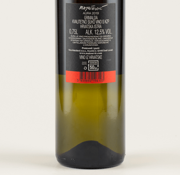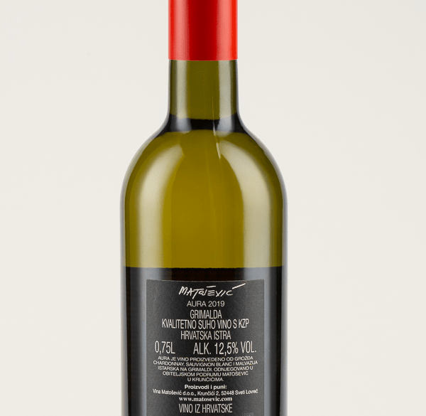 Matošević Chardonnay Aura is a blend of wines of the varieties Malvazija Istarska, Chardonnay and Sauvignon Blanc produced from grapes from an exceptional location.
